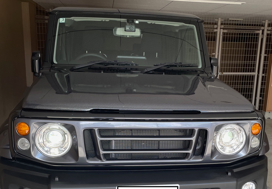 私のジムニーはブラックのボディにメッシュグリルを合わせているのですが、そこにクロームメッキの筆記体(Suzuki)が入ることで、グッと顔つきが引き締まりました。